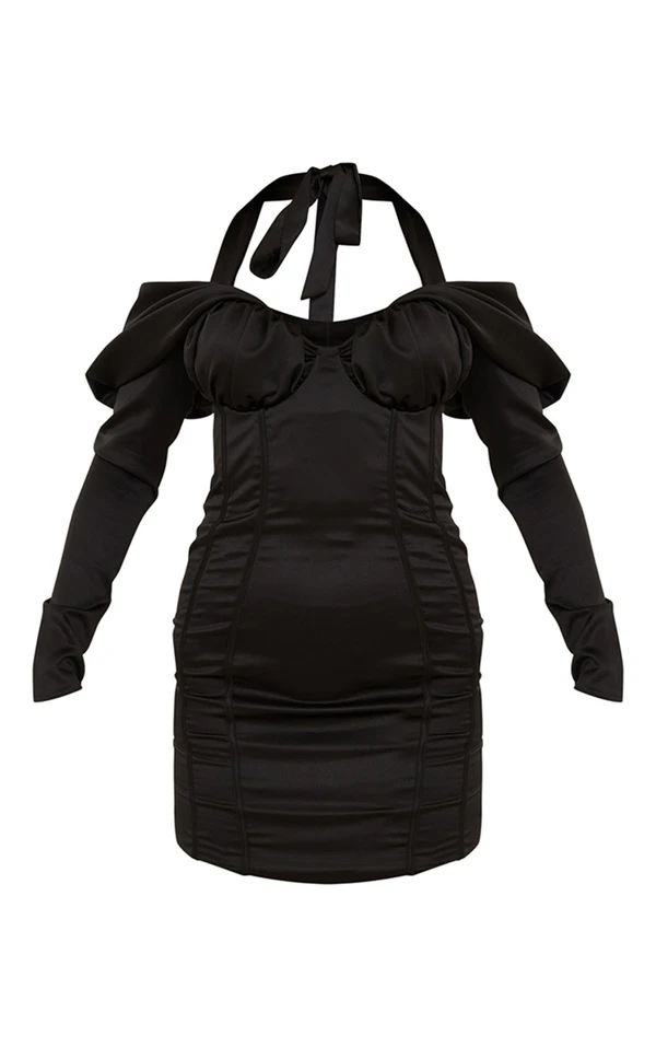 Label PLT Robe moulante structurée noire satinée drapée à col bardot