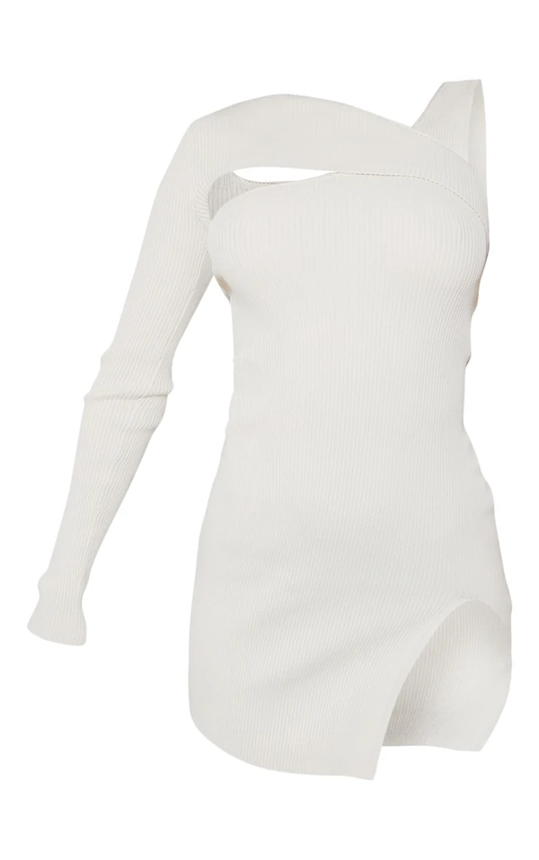 Mini robe asymétrique moulante crème en maille tricot côtelée