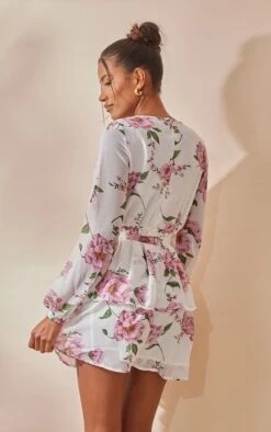 Robe Patineuse Blanche à Imprimé Floral En Mousseline De Soie Avec Décolleté Plongeant
