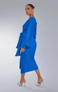 Robe Cache-coeur Mi-longue Bleu Vif Plissée à Manches Longues