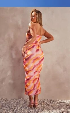 Robe Bustier Longue En Mesh Rose Froncée à Imprimé Abstrait