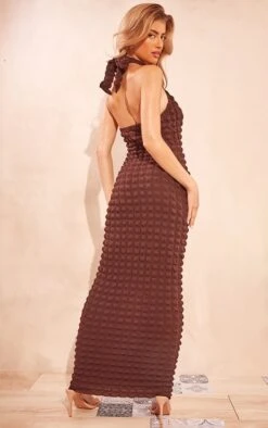 Robe asymétrique longue texturée bleue à col bardot et fronces