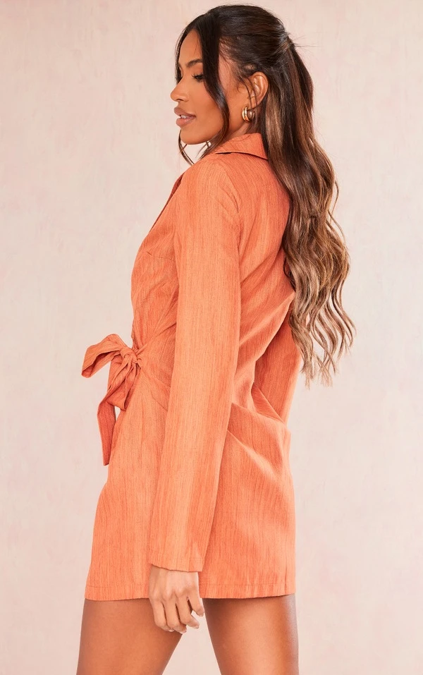 Robe blazer portefeuille texturée rouille effet lin nouée à la taille