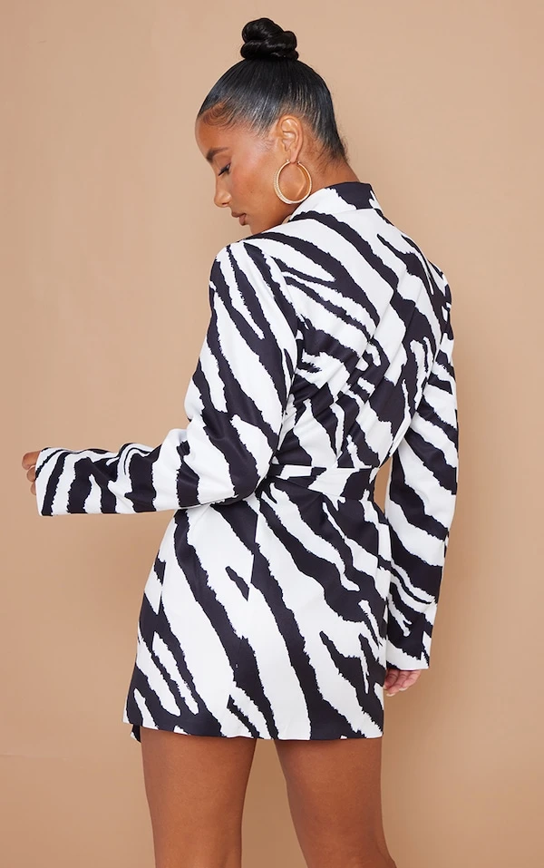 Robe blazer structurée imprimé zébré noir & blanc à nouer sur la taille