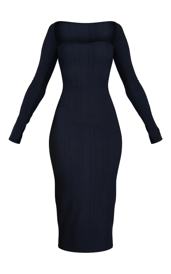 Robe bustier mi-longue côtelée texturée noire à détail manches