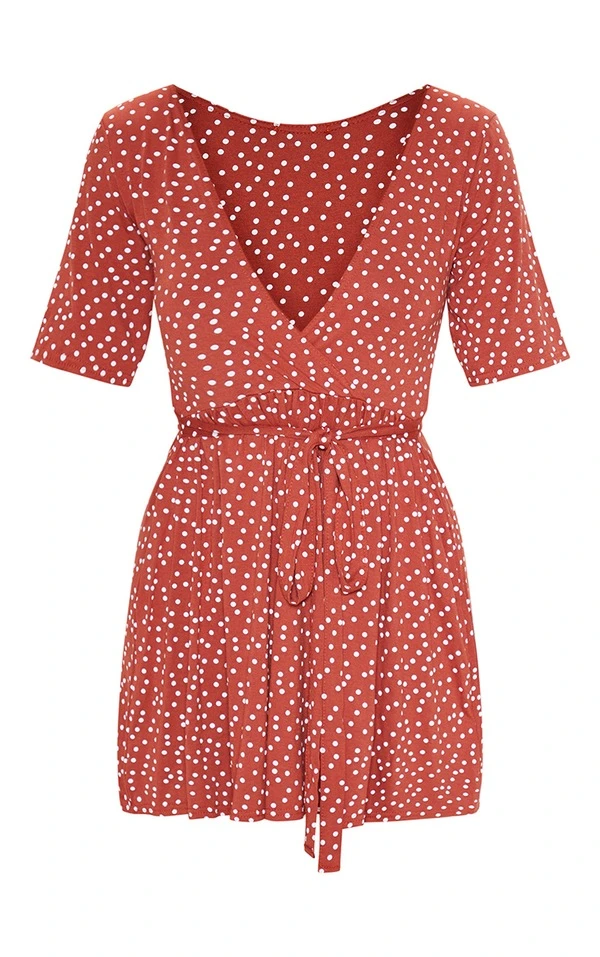 Robe cache-coeur terracotta imprimé pois à volants