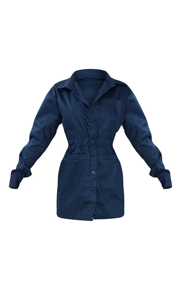 Robe chemise en maille sergée bleu marine à poches frontales et taille élastique