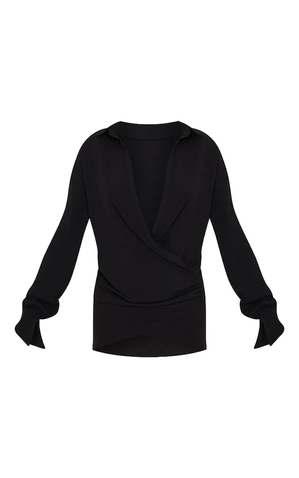 Robe chemise tissée noire texturée très décolletée à manchettes évasées