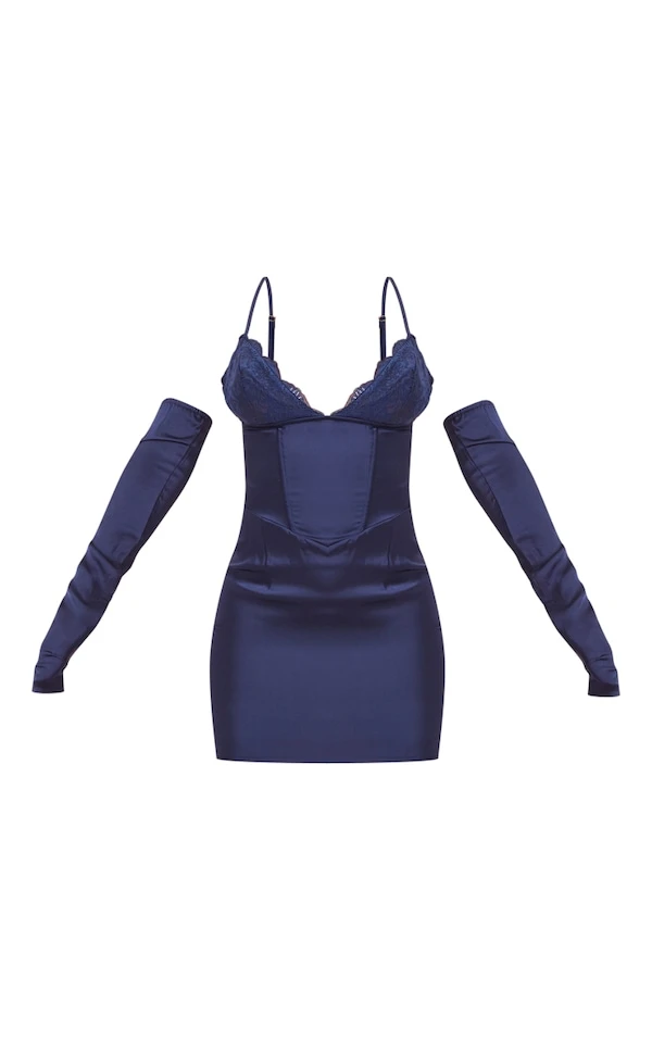 Robe droite bleu marine satinée à bonnets en dentelle et épaules dénudées