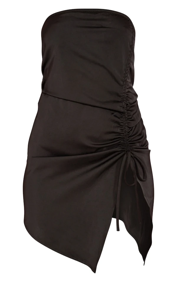 Robe droite bustier satinée noire à ourlet asymétrique et fronces