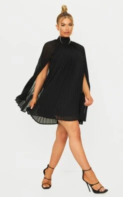 In love de cette robe! On craque complètement pour son style cape avec sa matière plissée au noir classique. Elle est parfaite pour la cocktail party associée à des talons et une paire de boucles d’oreilles dorées!