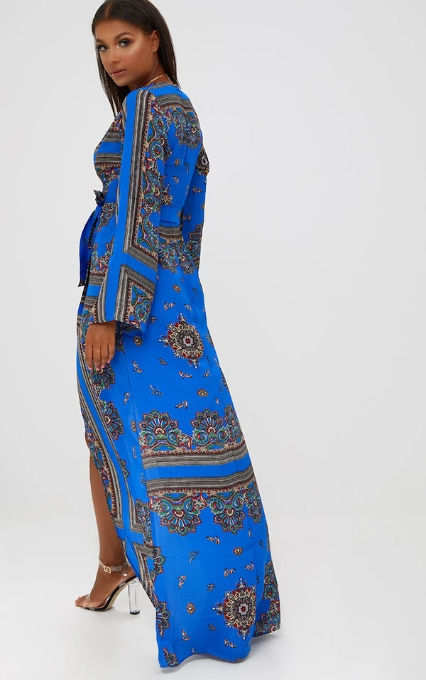 Robe Kimono Longue Bleu Cobalt à Imprimé Géométrique