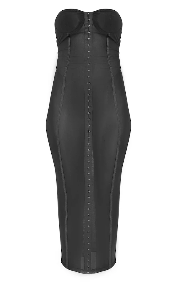 Robe longue bustier en mesh noir à crochets et oeillets détail coutures