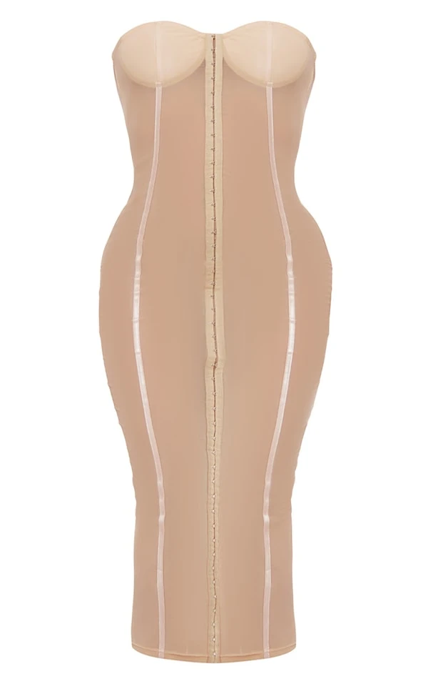 Robe longue bustier en mesh nude à crohets et oeillets détail coutures