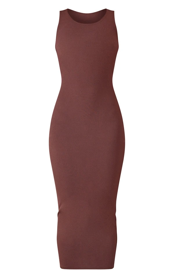 Robe longue chocolat côtelée à dos ouvert et lien taille
