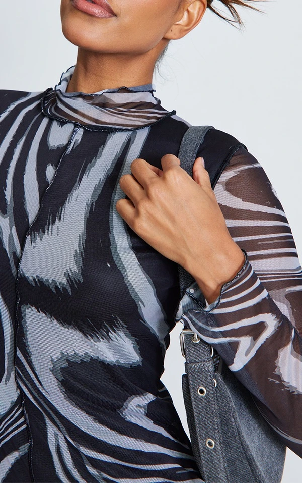 Robe longue en mesh imprimé noir & blanc à col montant et liserés contrastants