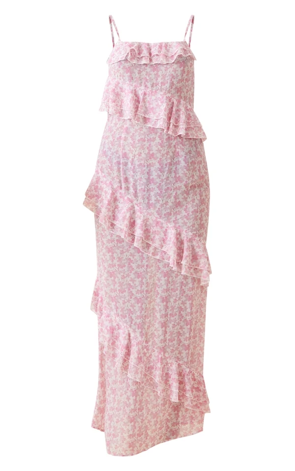 Robe longue en mousseline de soie rose fleurie et volants
