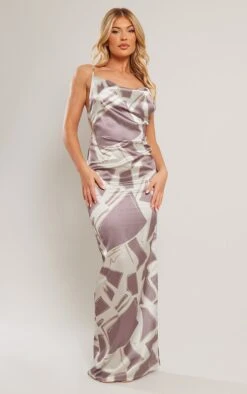Robe longue satinée marron imprimé abstrait à col bénitier
