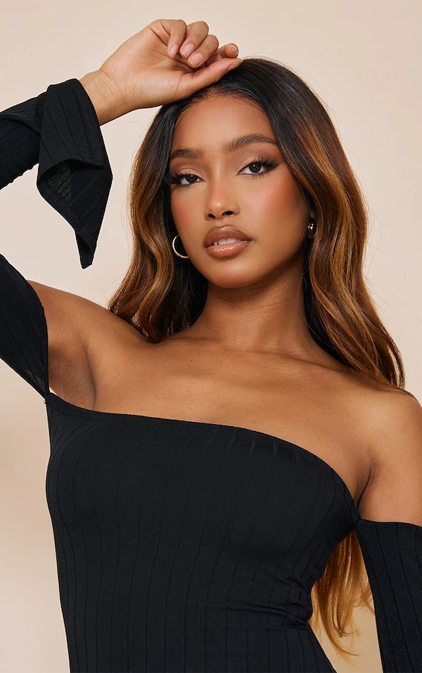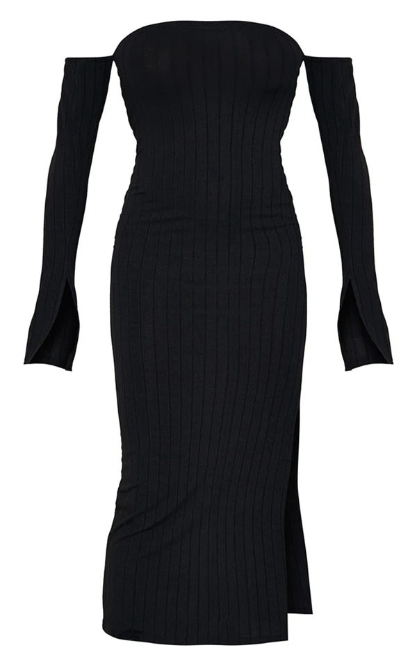 Robe mi-longue côtelée noire à col bardot et manches fendues