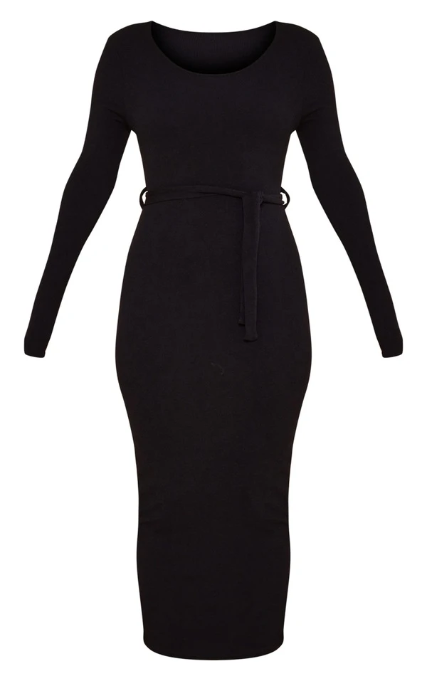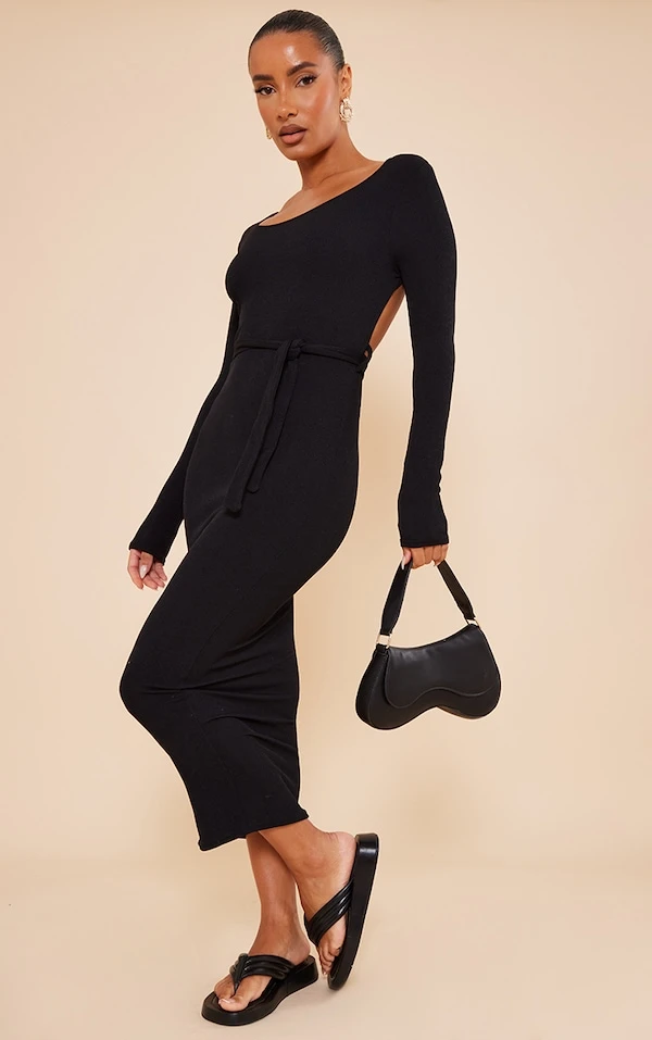 Robe mi-longue côtelée noire à dos ouvert et taille nouée