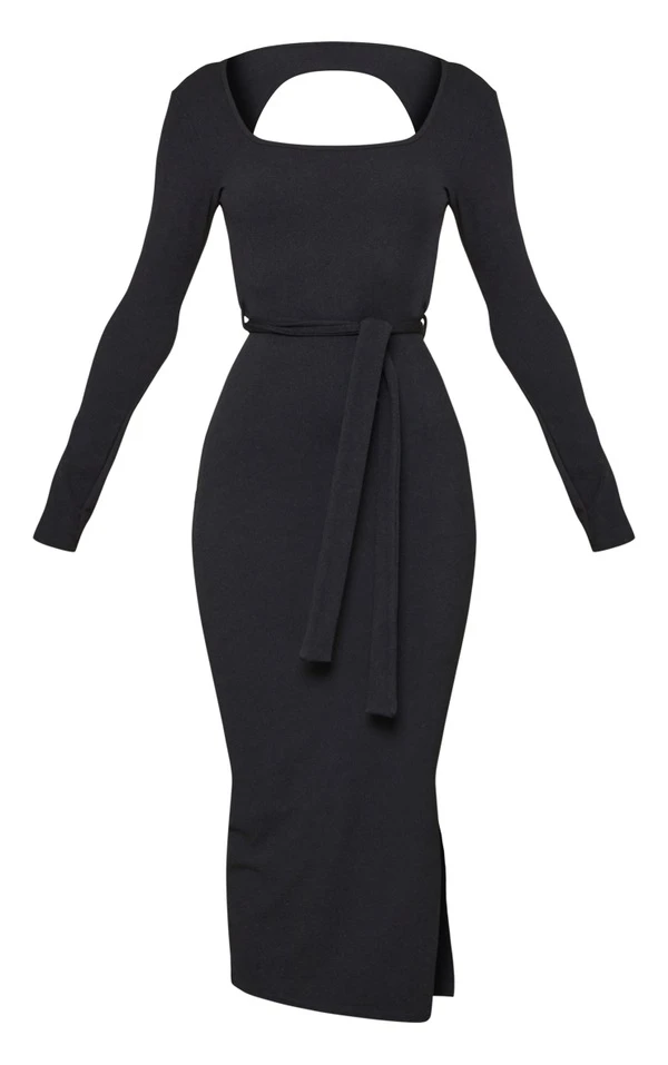 Robe mi-longue côtelée noire en maille tricot découpée et noué dans le dos
