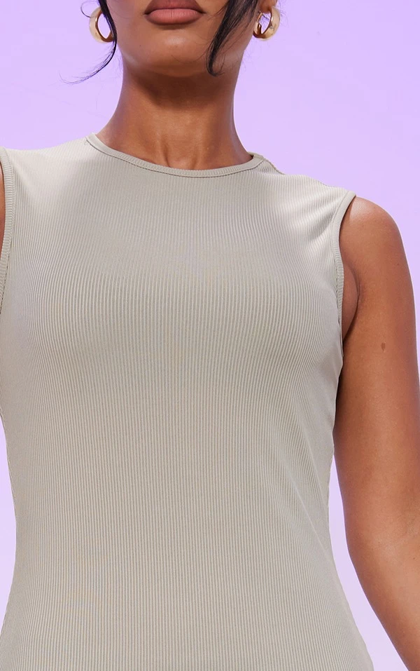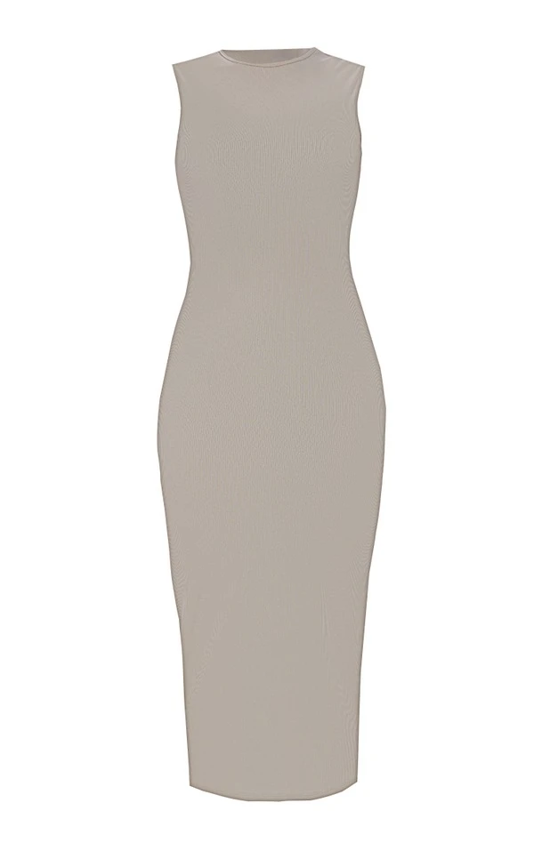 Robe mi-longue côtelée sable pâle sans manches à col ras
