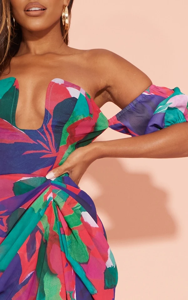 Robe mi-longue drapée multicolore imprimé abstrait à manches bouffantes et armatures