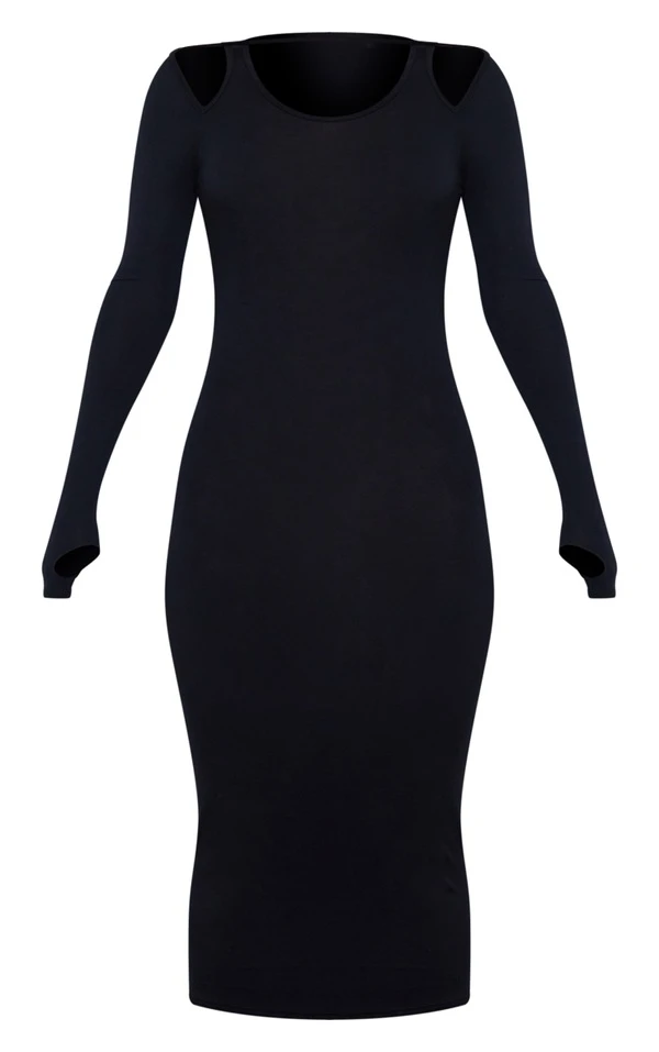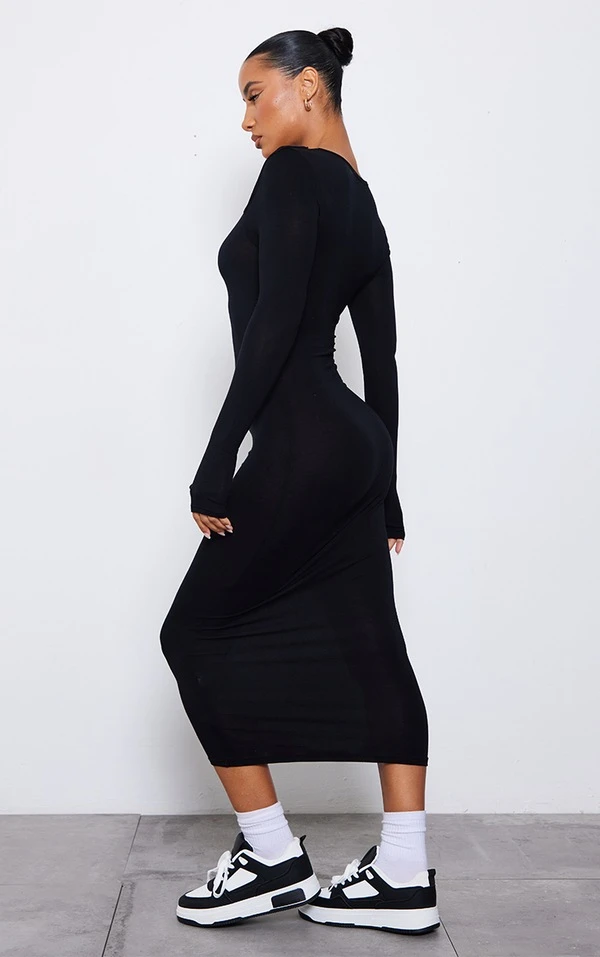 Robe mi-longue en jersey noir à bretelles et manches longues