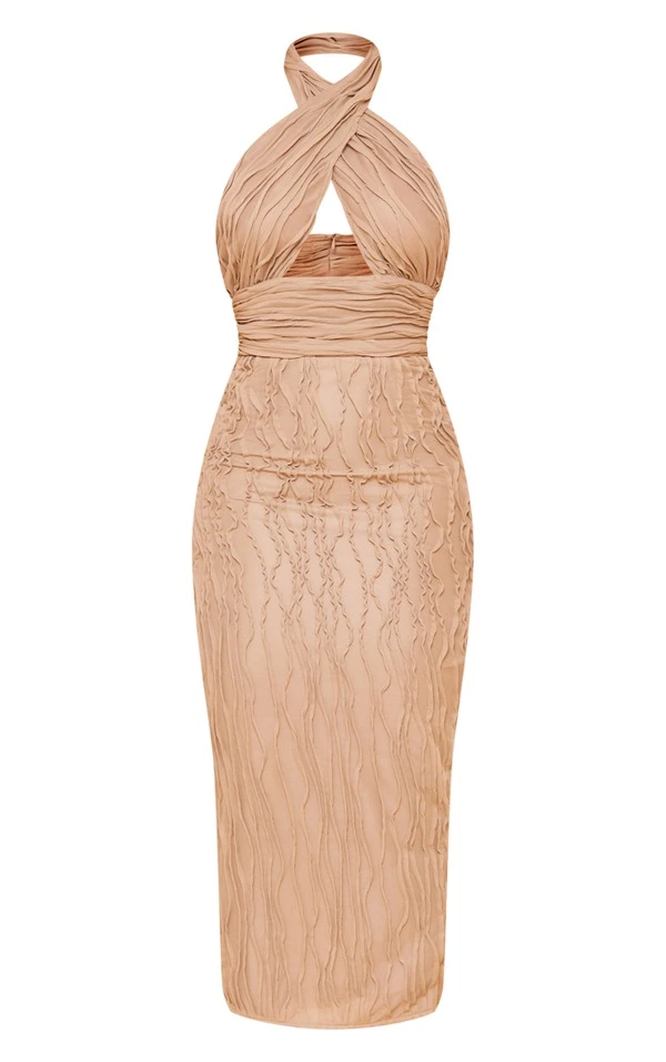 Robe mi-longue en jersey texturé café au lait à bretelles croisées au cou