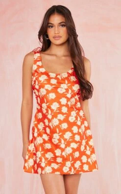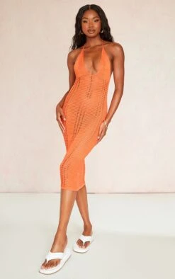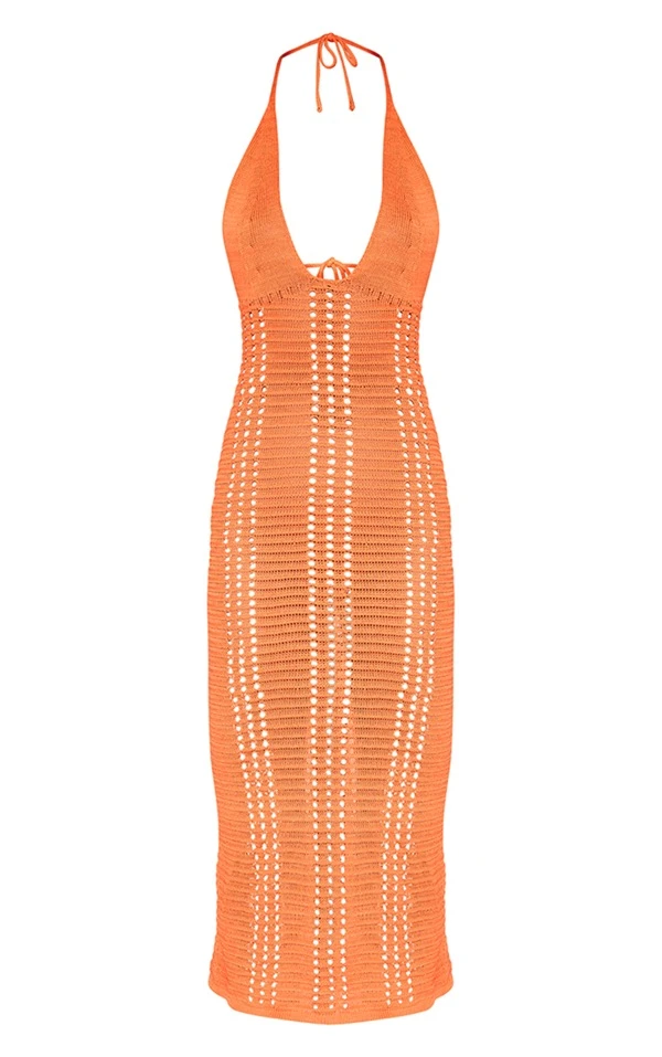 Robe mi-longue en maille crochet orange brûlé fleurie