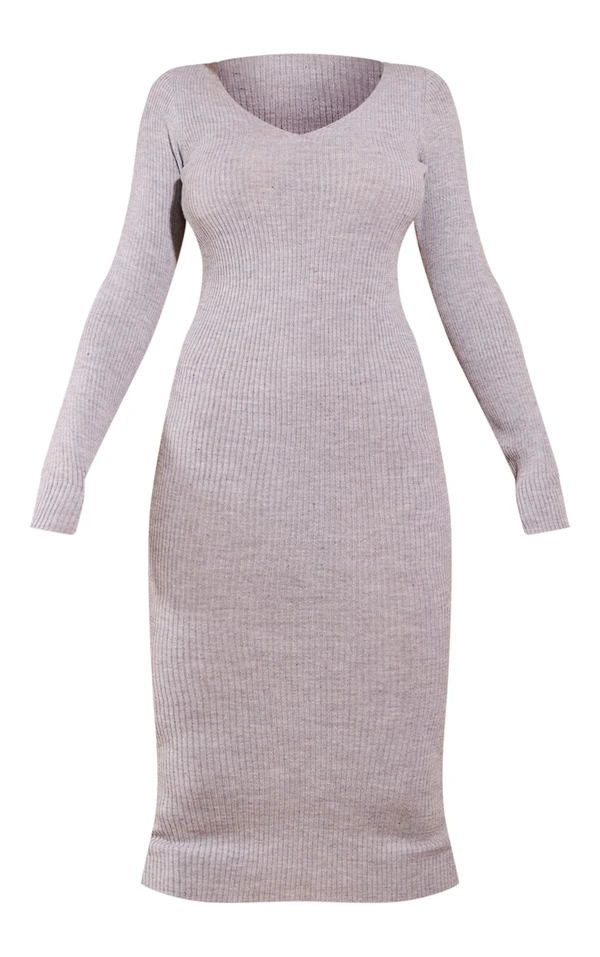 Robe mi-longue en maille gris clair à col en V