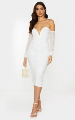 Robe mi-longue en mesh froncé blanc à col bardot et barre en V