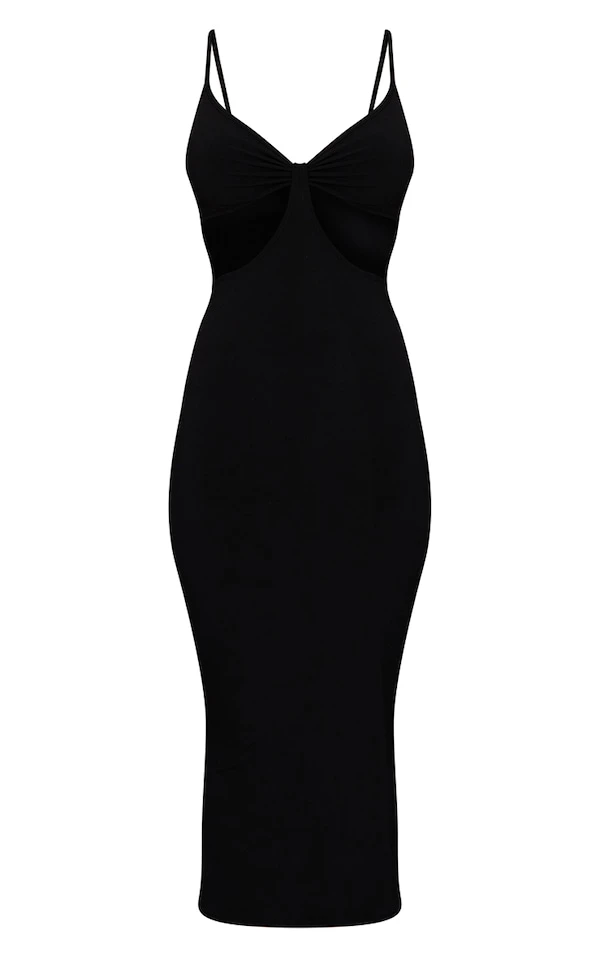 Robe mi-longue moulante noir ébène découpée à bretelles