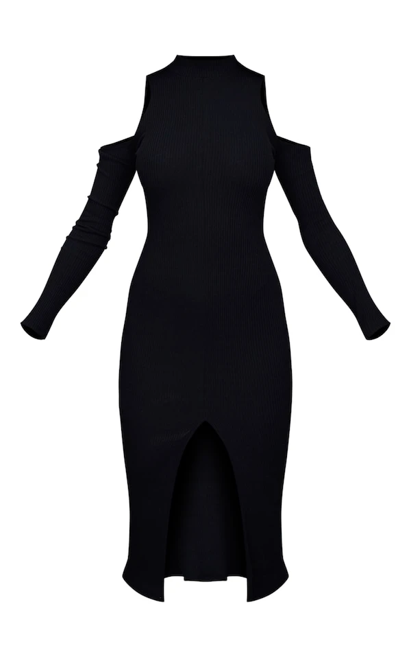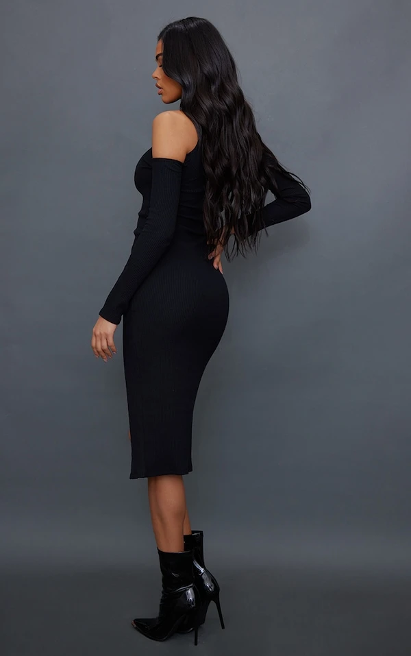 Robe mi-longue noire côtelée à épaules dénudées et fente