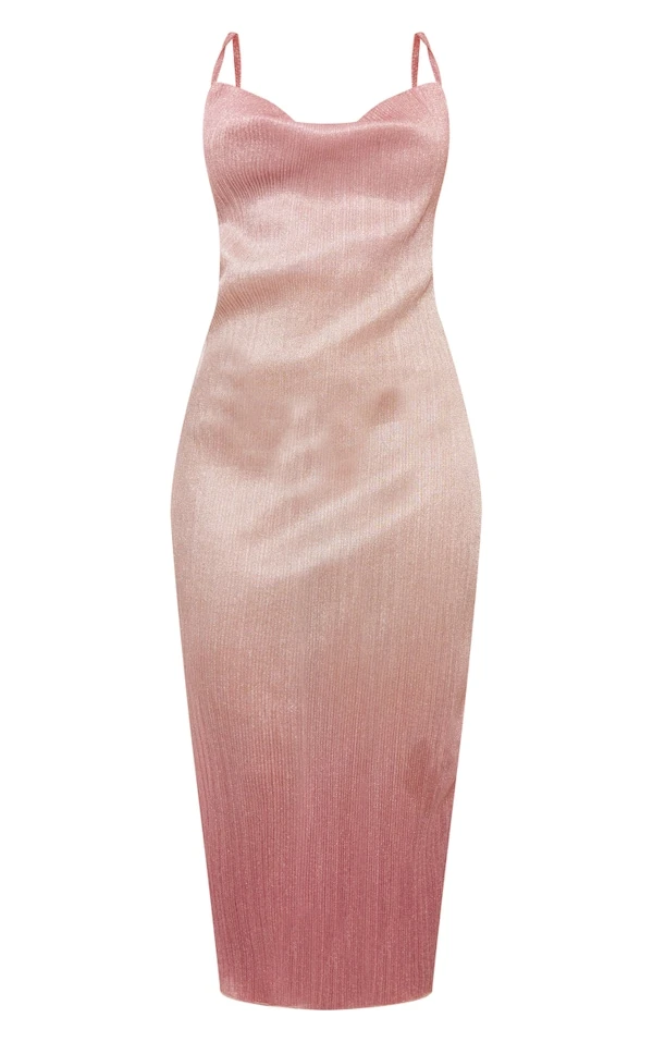 Robe mi-longue plissée rose à paillettes et col bénitier