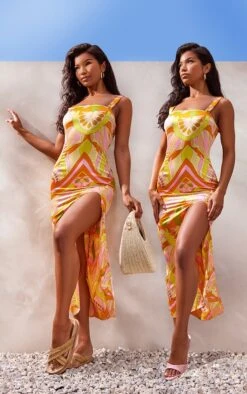 Robe mi-longue tissée orange imprimé abstrait fendue