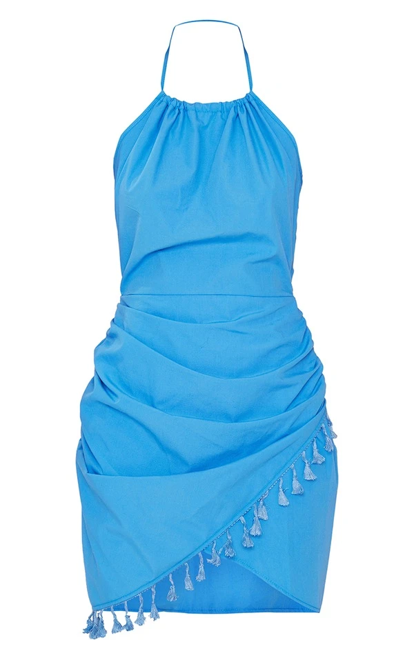 Une robe très mims qui fait rêver ! Avec son design à dos nu, sa couleur bleue et ses pompons, on a tellement crushé. Par une journée ensoleillée, on la porte avec des compensées en raphia et un max d’assurance.