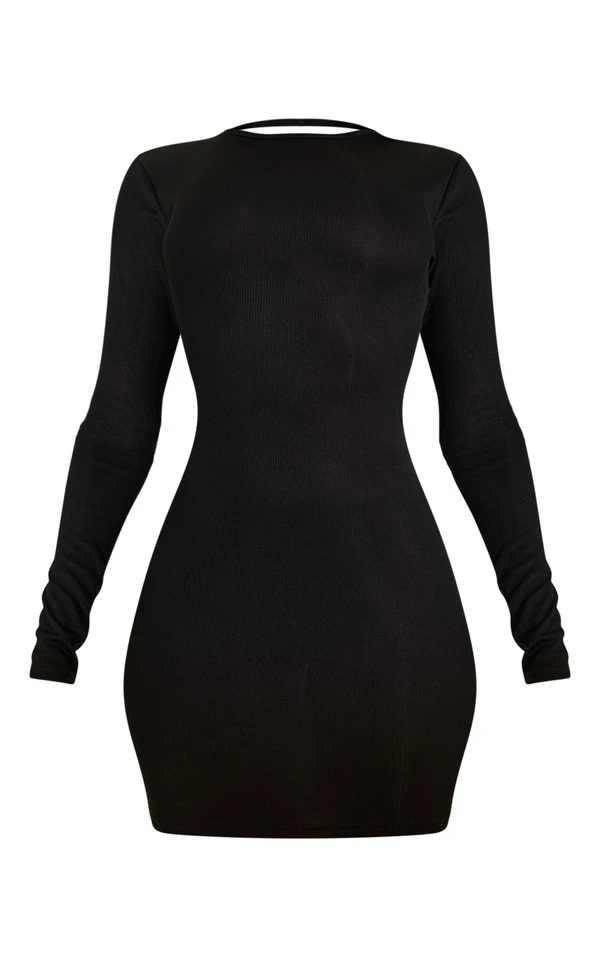 Robe moulante côtelée noire à dos nu et manches longues