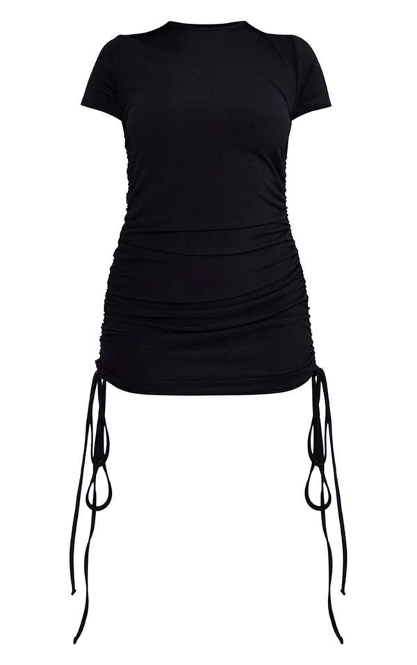 Robe moulante côtelée noire froncée sur les côtés à mancherons