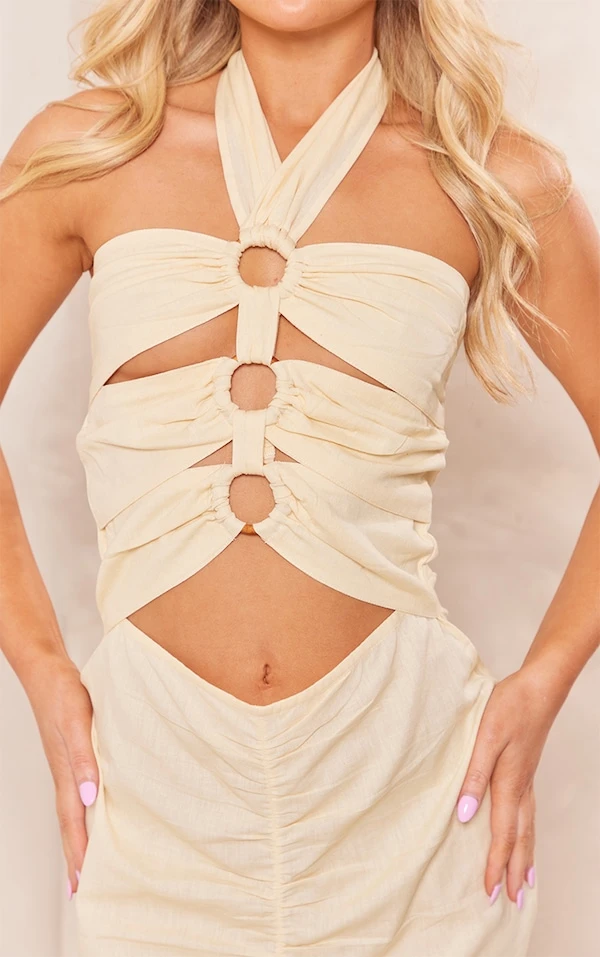 Robe moulante dos nu en effet lin crème à multiples découpes et anneaux