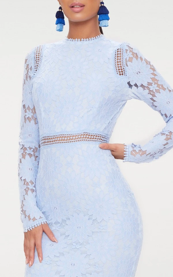 Cette superbe robe moulante trop mimi est parfaite pour une occasion spéciale. En dentelle bleu poudré avec des manches longues et une coupe moulante flatteuse, portez-la avec une paire de talons à brides et un sac pochette.