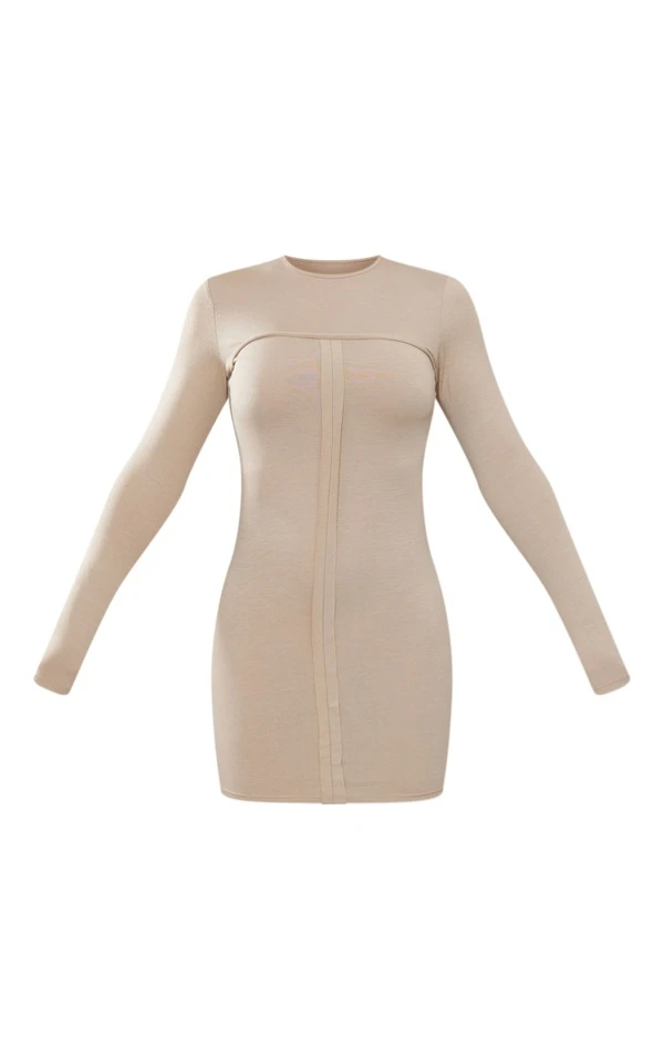 Robe moulante en jersey gris pierre manches longues à détail coutures
