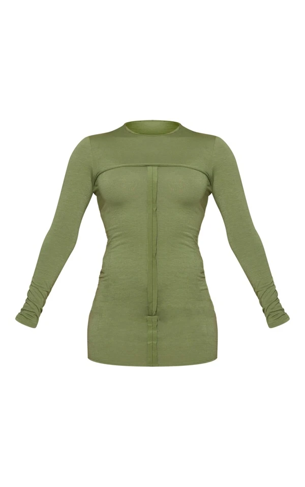 Robe moulante en jersey kaki manches longues à détail coutures