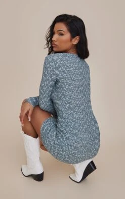 Robe moulante en mesh bleu imprimé jean à épaules dénudées
