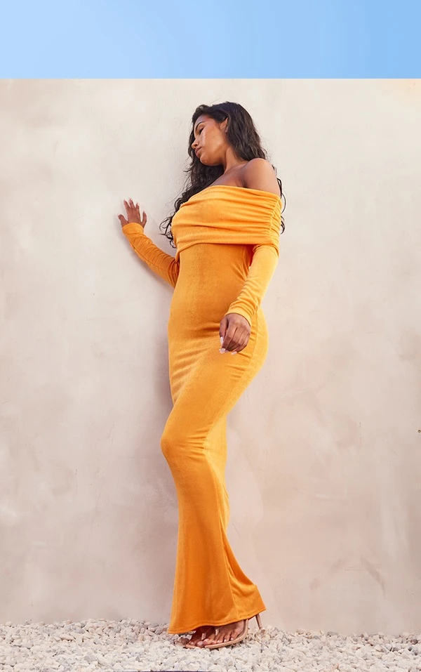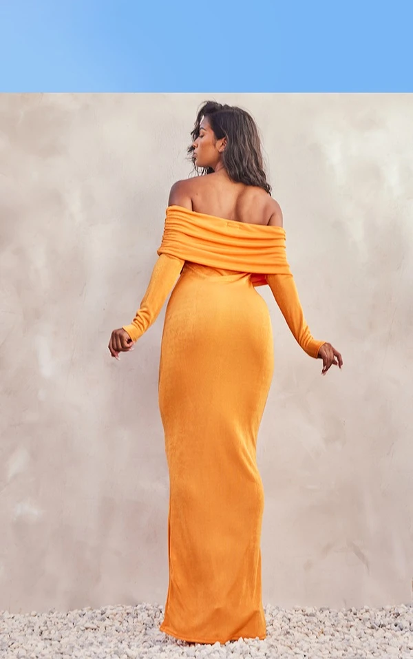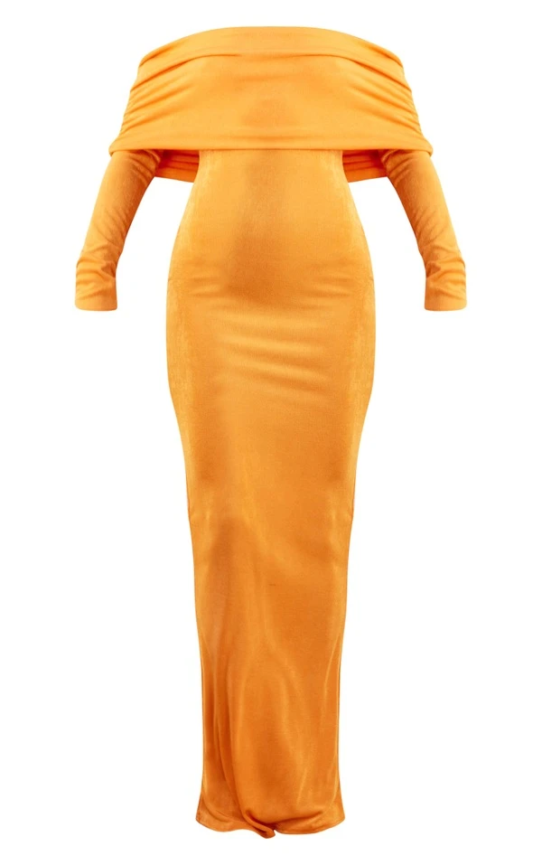 Robe moulante longue en acétate orange à manches longues et col bardot