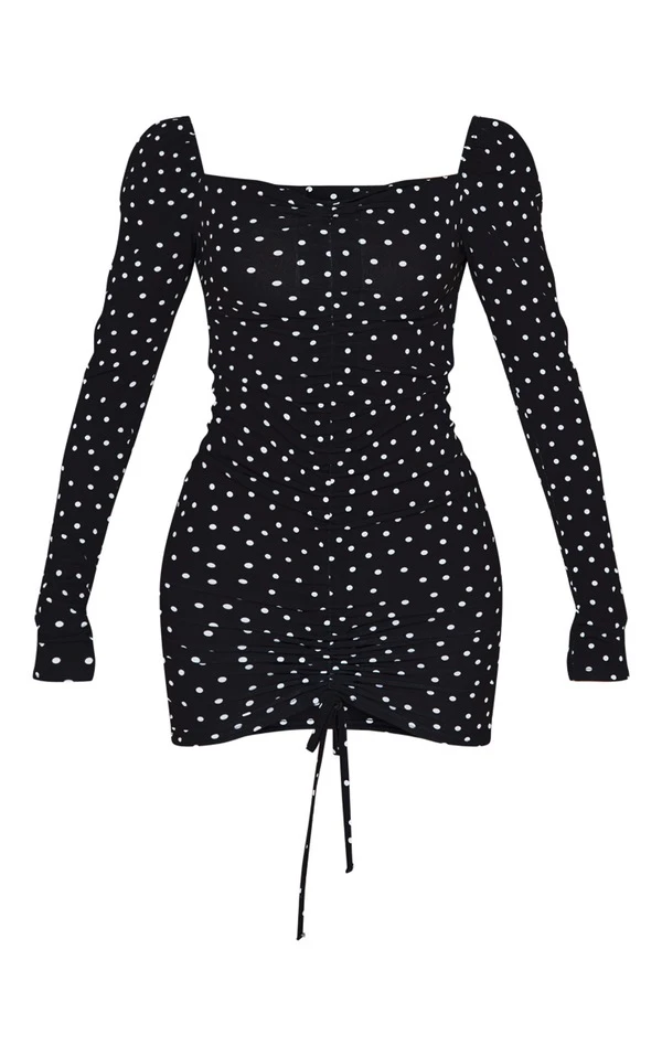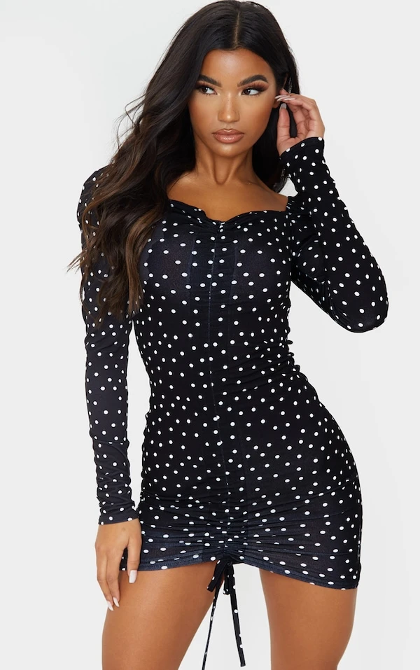 Robe moulante noir profond imprimé pois à manches longues et devant froncé
