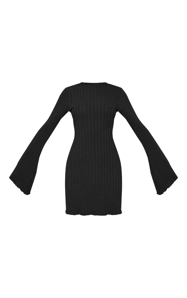 Robe moulante noire en maille côtelée large à manches évasées légèrement volantées