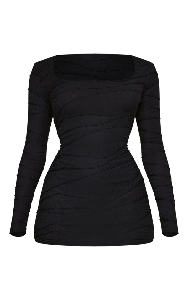 Robe moulante noire texturée à col rond et manches longues