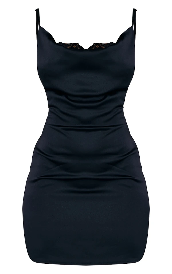 Robe moulante satinée noire à bretelles et parties en dentelle