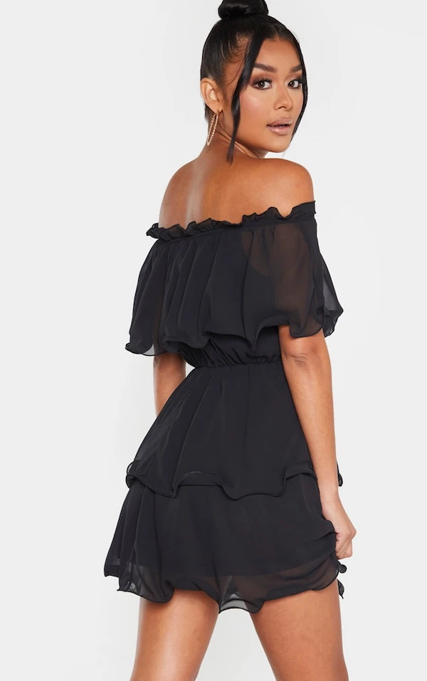 Vibes très romantiques avec cette robe à volants! On adore son design fluide et son col bardot si féminins. On la porte avec des sandales à talons et la dose de bijoux et go la soirée. Una bomba.